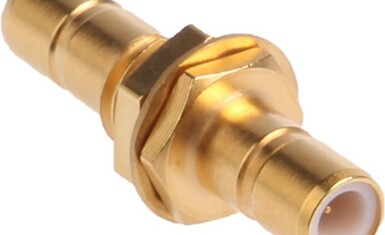 A 50 Ohm SMB RF coaxial bulkhead adapter with an SMB jack to SMB jack configuration.